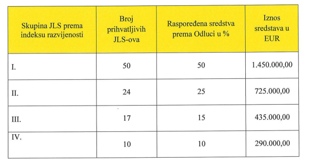 Ukupni planirani iznos financijskih sredstava za ovaj Natječaj je 2.900.000,00 EUR pri čemu su sredstva raspodijeljena po potpomognutim skupinama jedinica lokalne samouprave prema stupnju razvijenosti:
